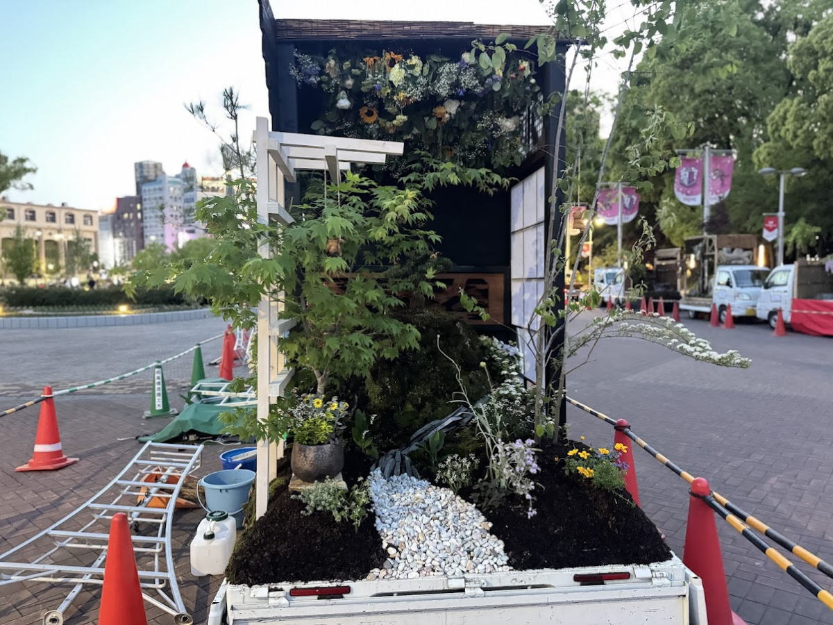 芸術のお庭がのっかったトラックがズラーっと並んでました。
