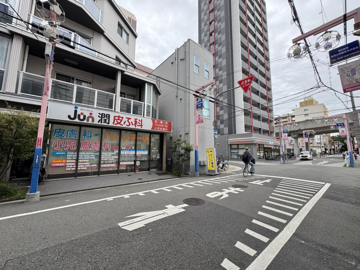 「古着無人販売24h」さんの前には「潤皮ふ科」さん、「さくら薬局」さんがあります。