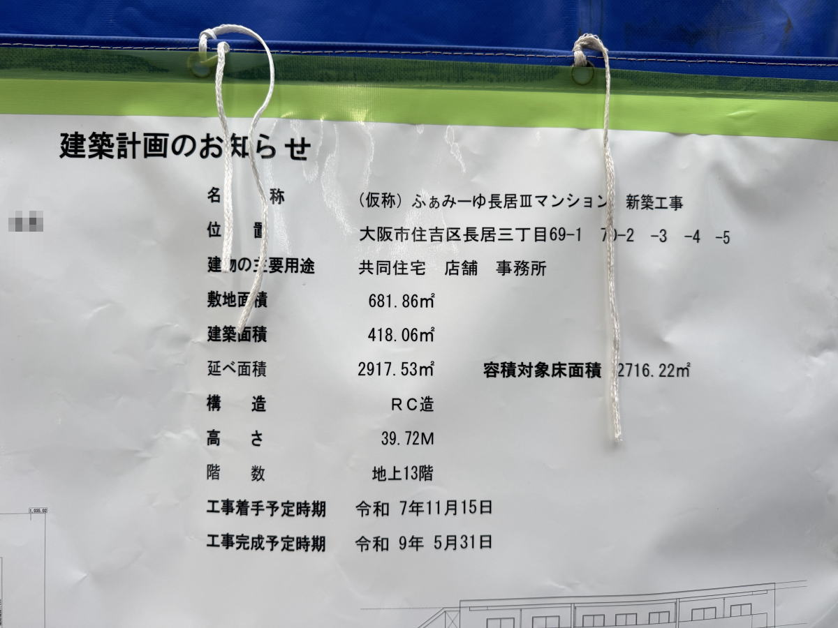 全部覆われてるってことは、全部解体ってことや思うんですが、「ふぁみーゆ長居Ⅲ」13階建て。