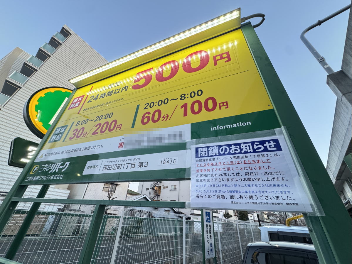 西田辺シャープ池横の「リパーク西田辺町」2026年3月21日をもって閉鎖になるみたいです。