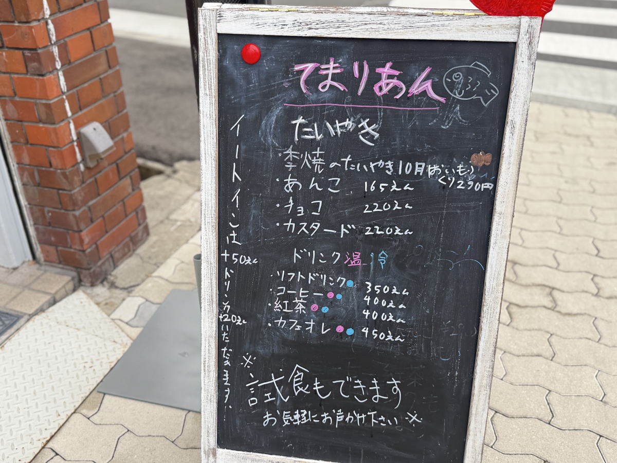 たいやきは、あんこ・チョコ・カスタード、季節のたいやきの4種類。コーヒー・紅茶・カフェオレ、ジュースもあります♪